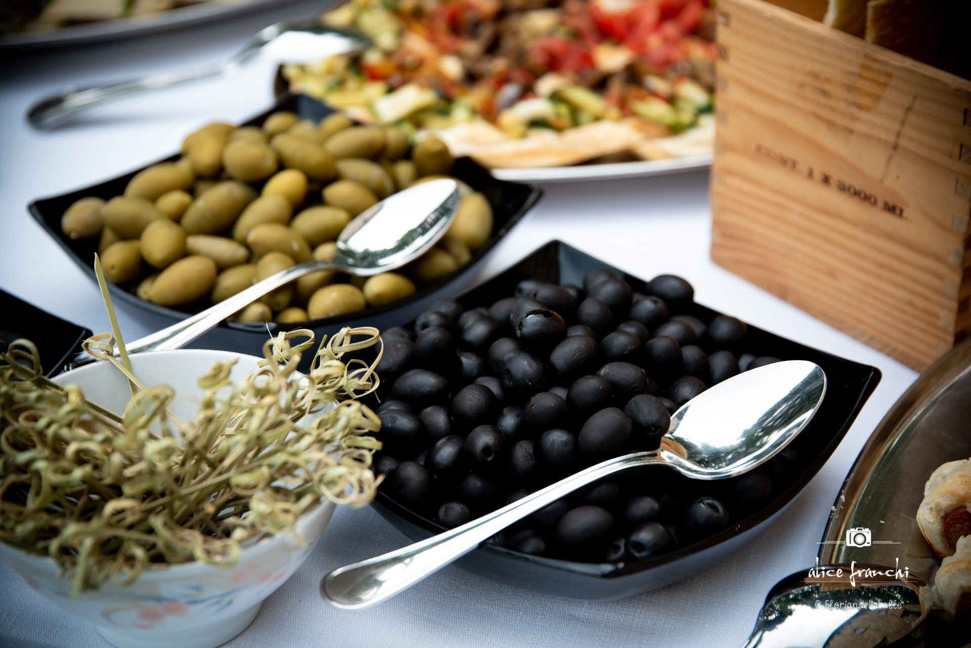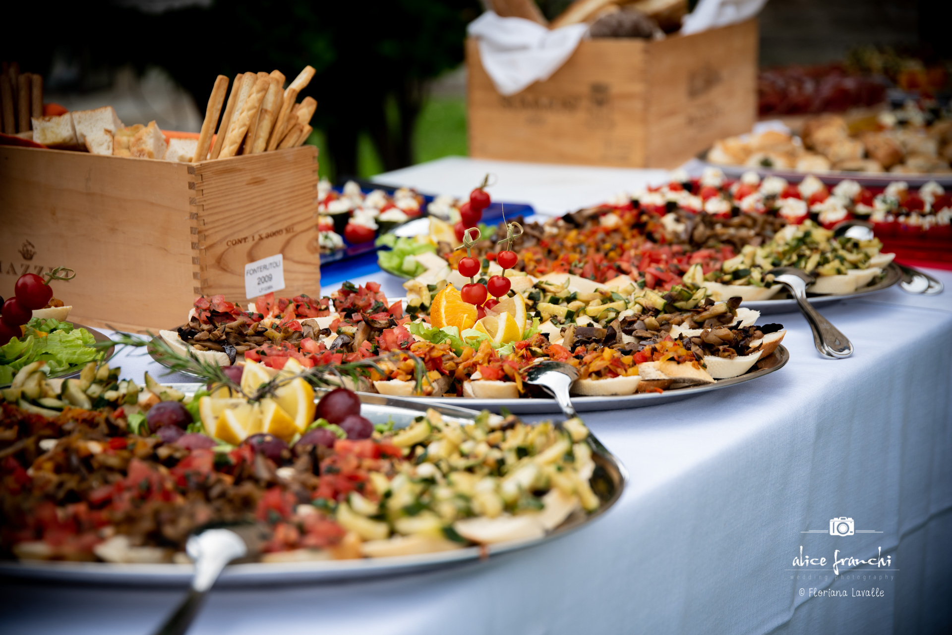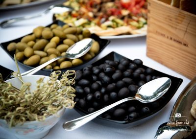 Aperitif food at a Tuscan wedding is usually a selection of the most delicious local produces such as Pecorino cheese served with honey dips and other relish, seasonal vegetable quiches, mozzarella and tomatoes skewers, cured meets, bruschettas etc.. Such delicious food for all types of diets, vegetarians, vegan etc..